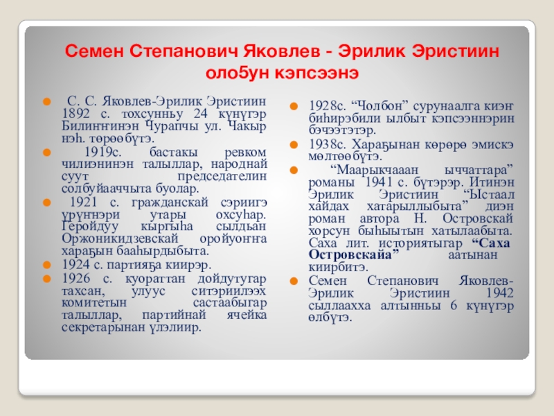 Семен Степанович Яковлев-Эрилик Эристиин 1942 сыллаахха алтынньы 6 күнүгэр өлбүтэ.