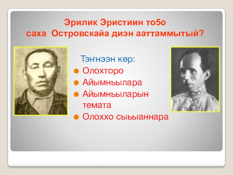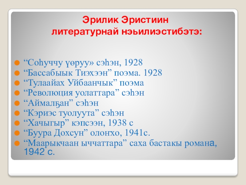 “Маарыкчааан ыччаттара” романы 1941 с. бүтэрэр. Итинэн Эрилик Эристиин “Ыстаал хайдах хатарыллыбыта” диэн роман автора Н. Островскай хорсун быһыытын хатылаабыта. Саха лит. историятыгар “Саха Островскайа” аатынан киирбитэ.
