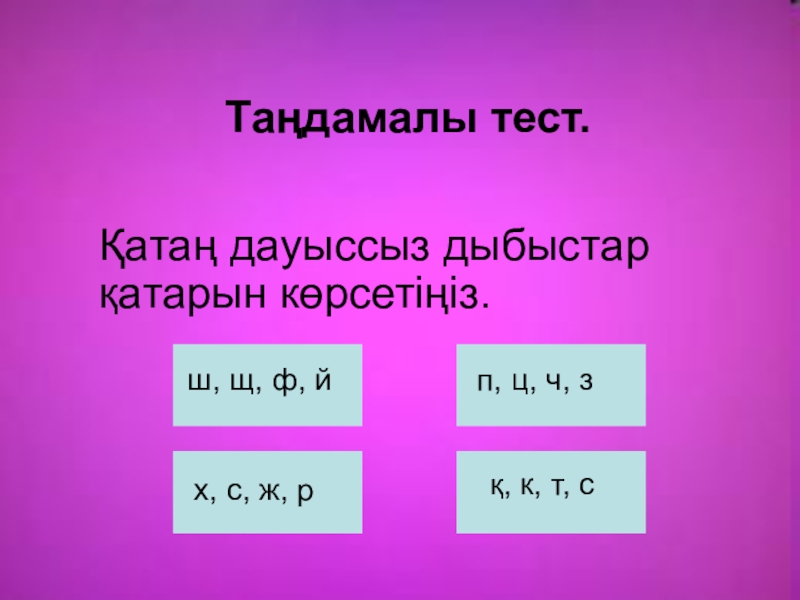 б, в, г, ғ, д, ж, з, й, к, қ, л, м, н, ң, п, р, с, т, ф, х, ц, ч, ш, щ, һ, (у) (25 дыбыс)