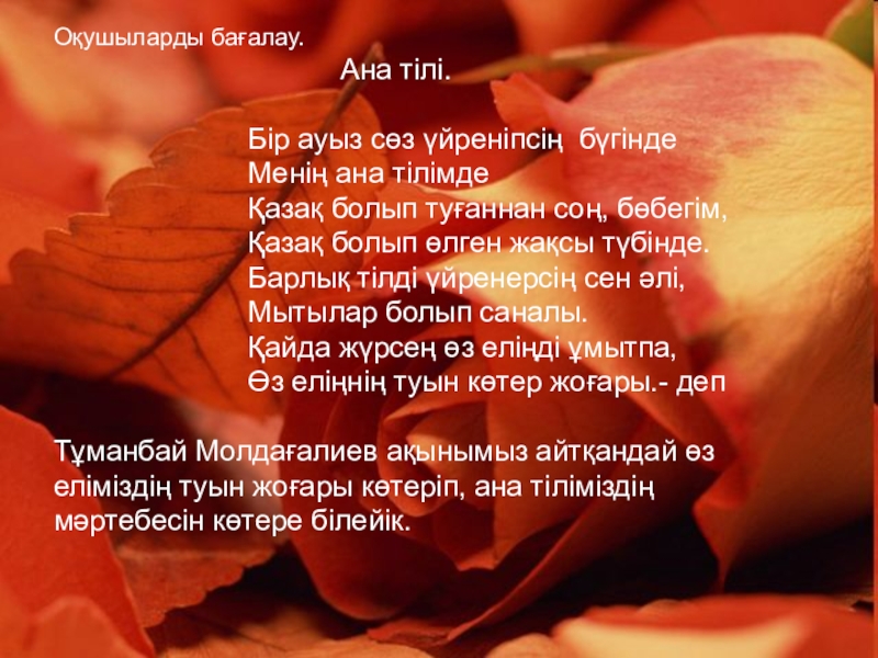 Тұманбай Молдағалиев ақынымыз айтқандай өз еліміздің туын жоғары көтеріп, ана тіліміздің мәртебесін көтере білейік.