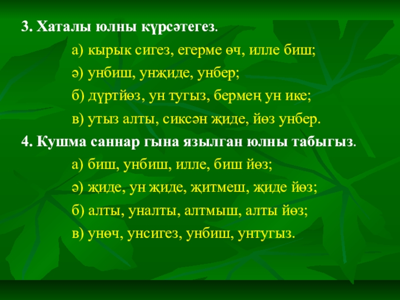 3. Хаталы юлны күрсәтегез.       а) кырык сигез, егерме өч, илле биш;