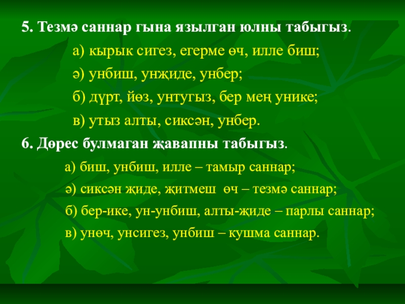 5. Тезмә саннар гына язылган юлны табыгыз.       а) кырык сигез, егерме