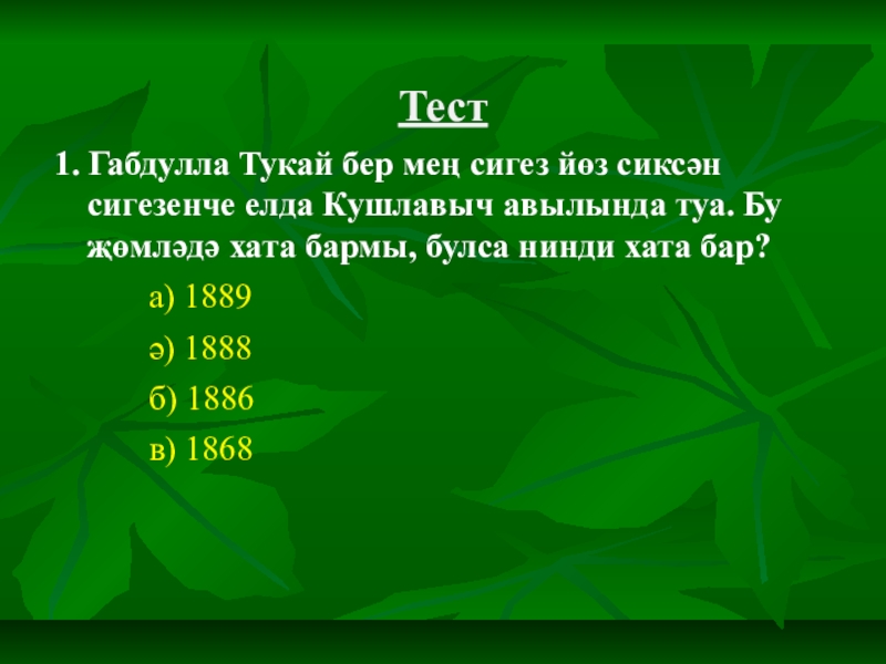 Тест1. Габдулла Тукай бер мең сигез йөз сиксән сигезенче елда Кушлавыч авылында туа. Бу җөмләдә хата бармы,