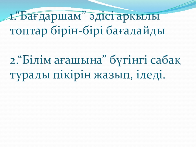 Слайд 131.“Бағдаршам” әдісі арқылы топтар бірін-бірі бағалайды 2.“Білім ағашына” бүгінгі сабақ туралы пікірін