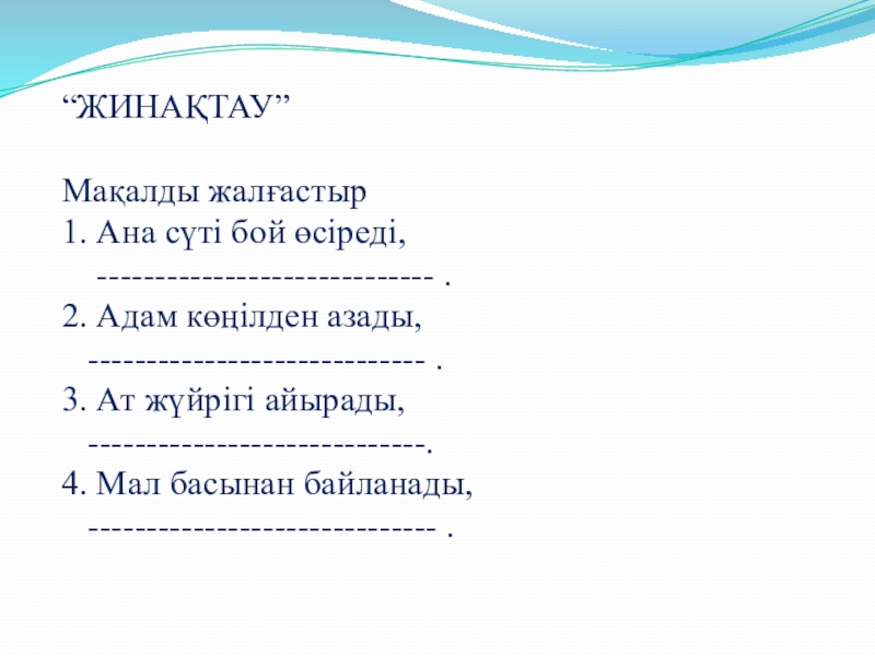 Слайд 8“ЖИНАҚТАУ” Мақалды жалғастыр 1. Ана сүті бой өсіреді, ----------------------------- . 2. Адам көңілден