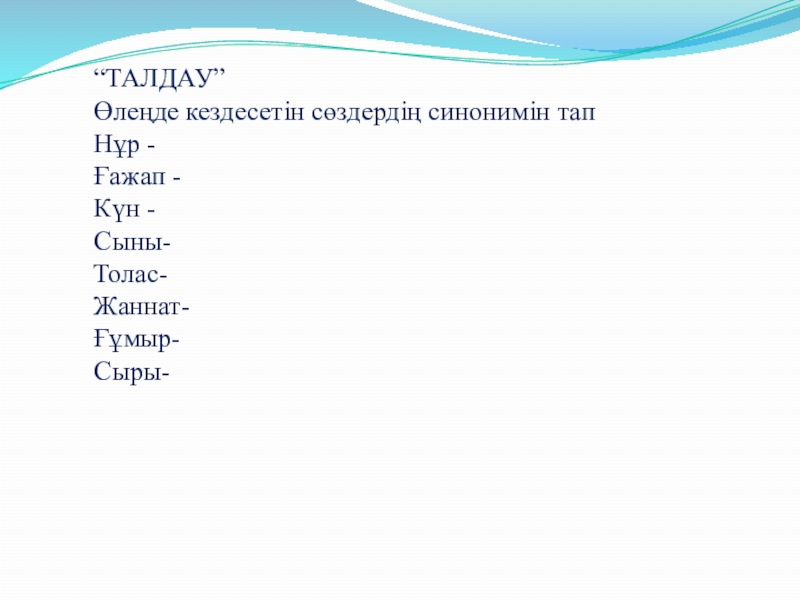 Слайд 6 “ТАЛДАУ” Өлеңде кездесетін сөздердің синонимін тап Нұр - Ғажап - Күн - Сыны- Толас- Жаннат- Ғұмыр- Сыры-