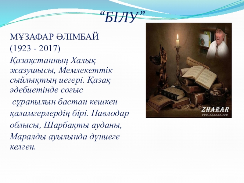 “БІЛУ” МҰЗАФАР ӘЛІМБАЙ(1923 - 2017)Қазақстанның Халық жазушысы, Мемлекеттік сыйлықтың иегері. Қазақ