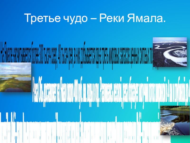Река Обь доставляет на Ямал около 400 куб. км. воды в год. Разливаясь весной, река образует могучий поток шириной в 4 км и глубиной до 40 метров.