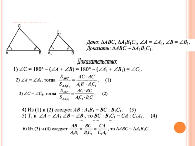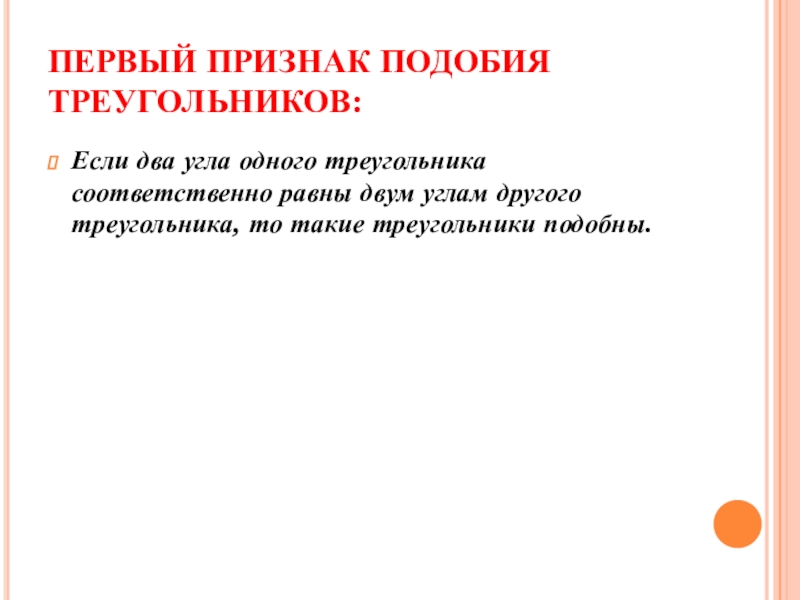 Слайд 6ПЕРВЫЙ ПРИЗНАК ПОДОБИЯ ТРЕУГОЛЬНИКОВ: