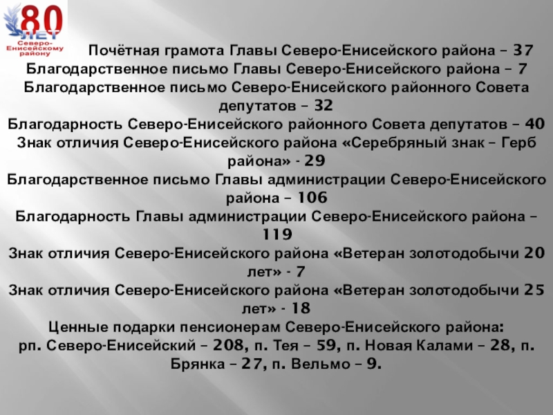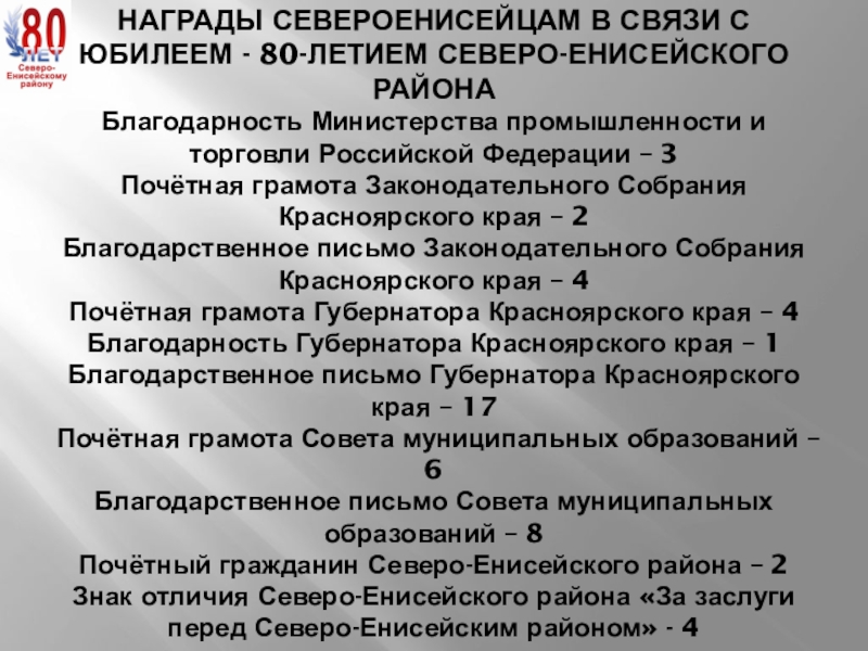 Слайд 10НАГРАДЫ СЕВЕРОЕНИСЕЙЦАМ В СВЯЗИ С ЮБИЛЕЕМ - 80-ЛЕТИЕМ СЕВЕРО-ЕНИСЕЙСКОГО РАЙОНА
