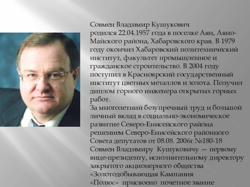 За многолетний безупречный труд и большой личный вклад в социально-экономическое развитие Северо-Енисейского района решением Северо-Енисейского районного Совета депутатов от 08.08. 2006г.№180-18 Совмен Владимиру Кушуковичу — первому вице-президенту, исполнительному директору закрытого акционерного общества «Золотодобывающая Кампания «Полюс» присвоено почетное звание «Почетный гражданин Северо-Енисейского района»