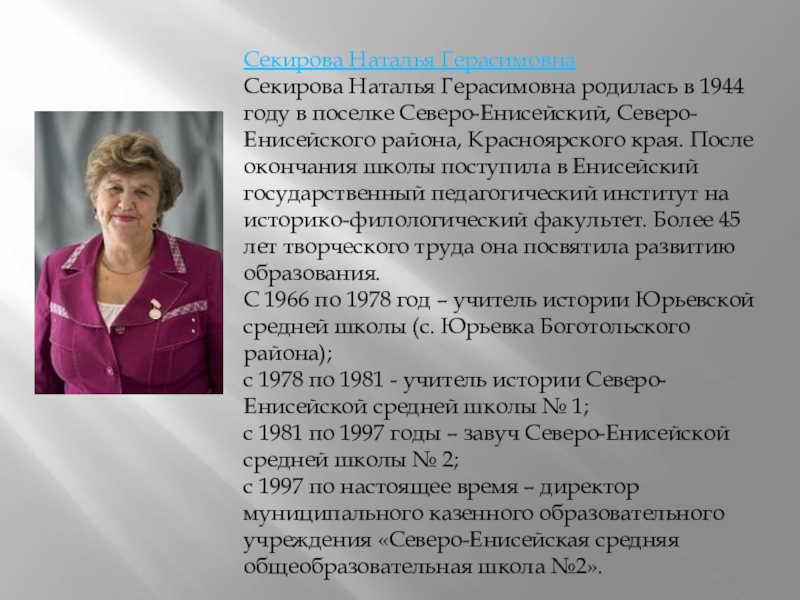 Секирова Наталья Герасимовна родилась в 1944 году в поселке