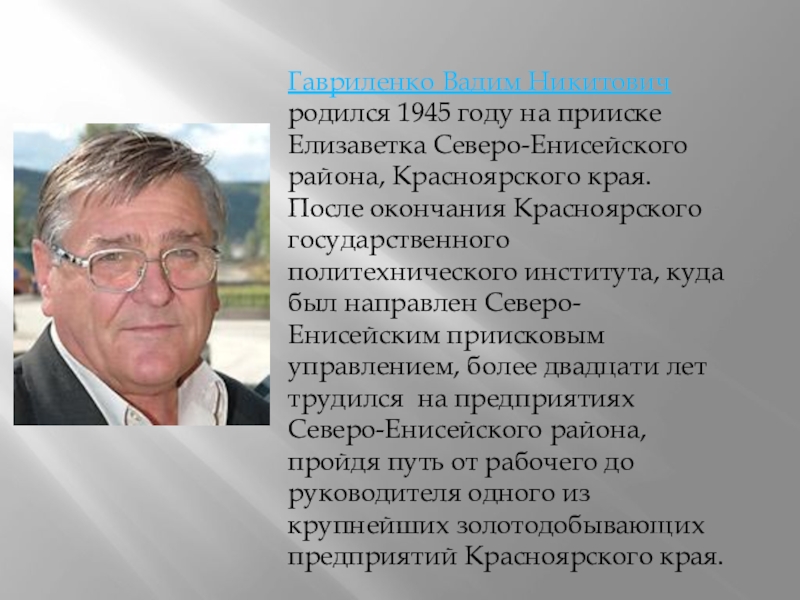 родился 1945 году на прииске Елизаветка Северо-Енисейского района, Красноярского