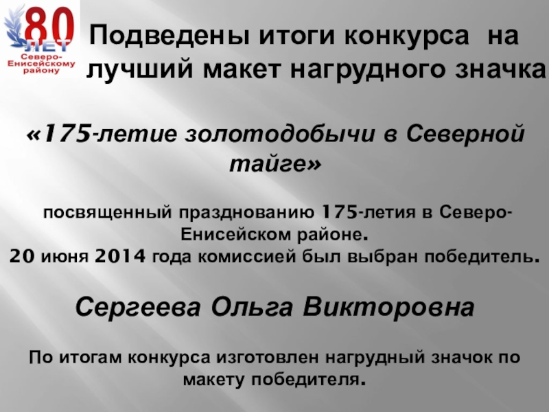 посвященный празднованию 175-летия в Северо-Енисейском районе.