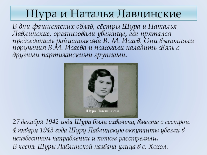 27 декабря 1942 года Шура была схвачена, вместе с сестрой. 4 января 1943 года Шуру Лавлинскую оккупанты увезли в неизвестном направлении и потом расстреляли.