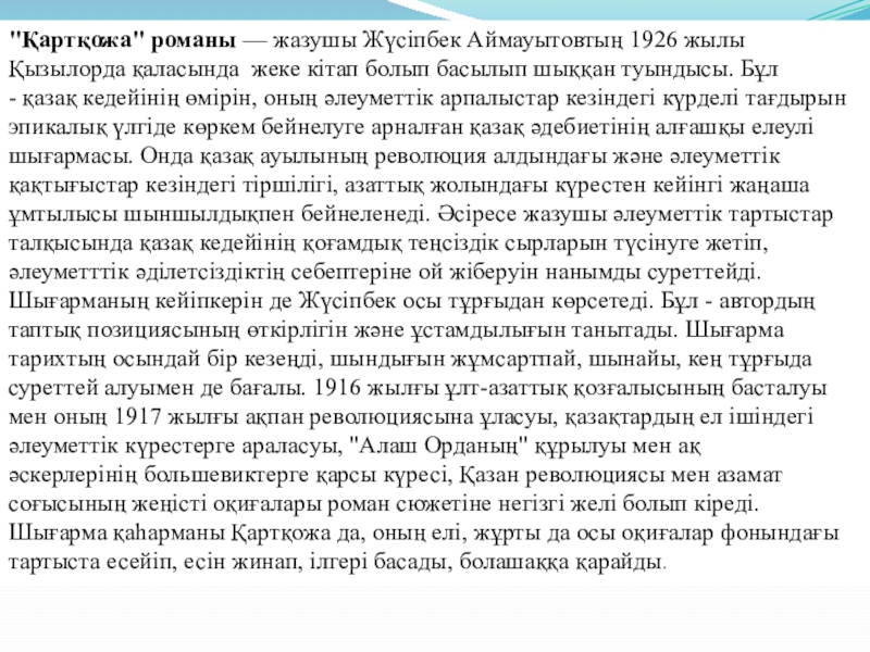 Ереуіл атқа ер салған қазақ елінің өзі екені «Қартқожа» романының «Көтеріліс», «Жасақ», «Күрес», «Байтал жоқ», «Тамақ», «Ән» атты тараушаларында жеріне жеткізе, шынайы суреттелген.