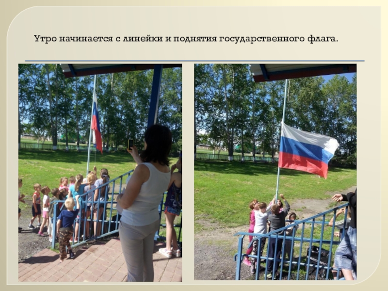 Слайд 3Утро начинается с линейки и поднятия государственного флага.