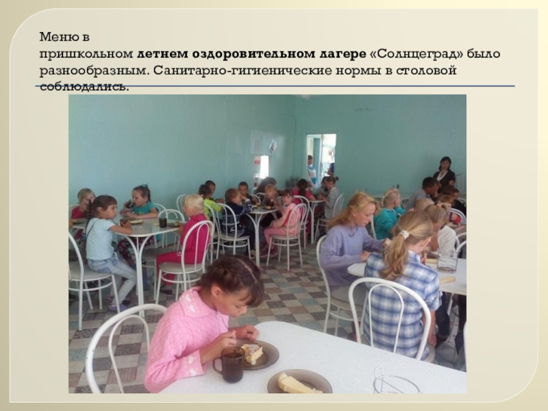 Слайд 6Меню в пришкольном летнем оздоровительном лагере «Солнцеград» было разнообразным. Санитарно-гигиенические нормы в столовой соблюдались.