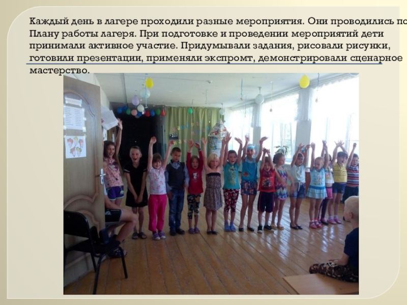 Слайд 7Каждый день в лагере проходили разные мероприятия. Они проводились по Плану работы