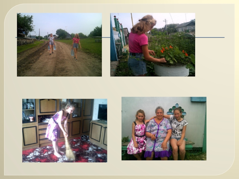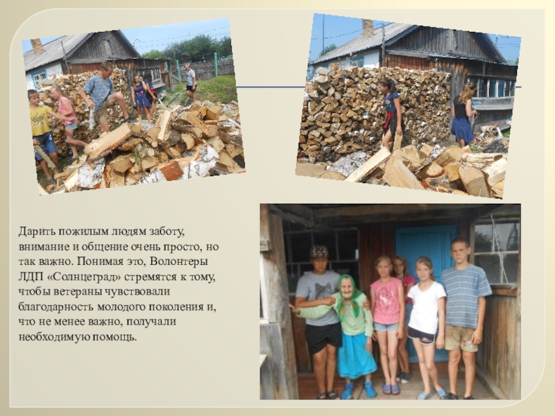 свой посильный вклад. Ребята совместно с воспитателями помогали пожилым людям: пололи грядки, приносили питьевую воду, складывали дрова. Девочки с удовольствием мыли полы, протирали пыль. Ветераны были довольны работой детей, поблагодарили девочек за внимание и помощь. А девчонки на прощание пели для них любимые песни и частушки.Настроение у бабушек заметно улучшилось.