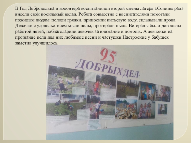 Слайд 13В Год Добровольца и волонтёра воспитанники второй смены лагеря «Солнцеград» внесли