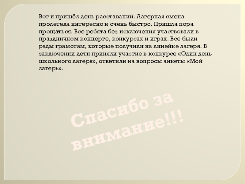 Слайд 23Вот и пришёл день расставаний. Лагерная смена пролетела интересно и очень