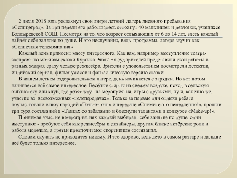 Слайд 22 июля 2018 года распахнул свои двери летний лагерь дневного пребывания
