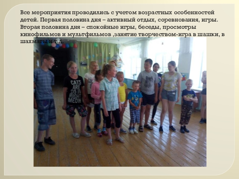 Слайд 8Все мероприятия проводились с учетом возрастных особенностей детей. Первая половина дня –