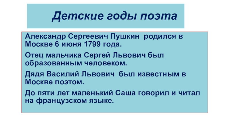 Детские годы поэтаАлександр Сергеевич Пушкин родился в Москве 6 июня 1799 года.Отец мальчика Сергей Львович был образованным человеком.Дядя Василий Львович был известным в Москве поэтом.До пяти лет маленький Саша говорил и