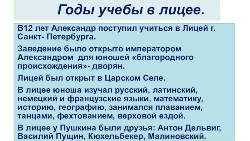 Годы учебы в лицее.В12 лет Александр поступил учиться в Лицей