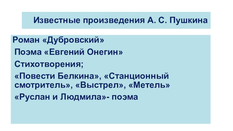 Известные произведения А. С. ПушкинаРоман «Дубровский»Поэма «Евгений Онегин»Стихотворения;«Повести Белкина», «Станционный смотритель», «Выстрел», «Метель»«Руслан и Людмила»-