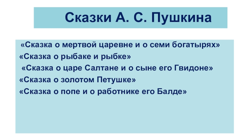 Сказки А. С. Пушкина «Сказка о мертвой царевне и о семи богатырях»«Сказка о рыбаке и