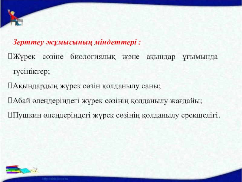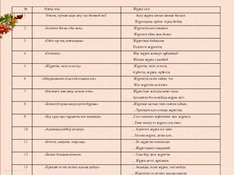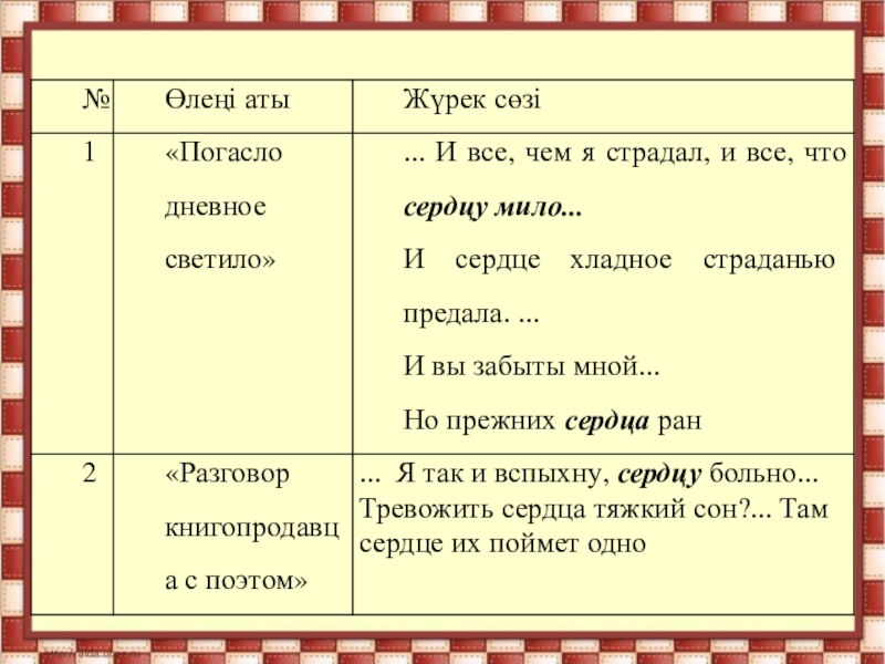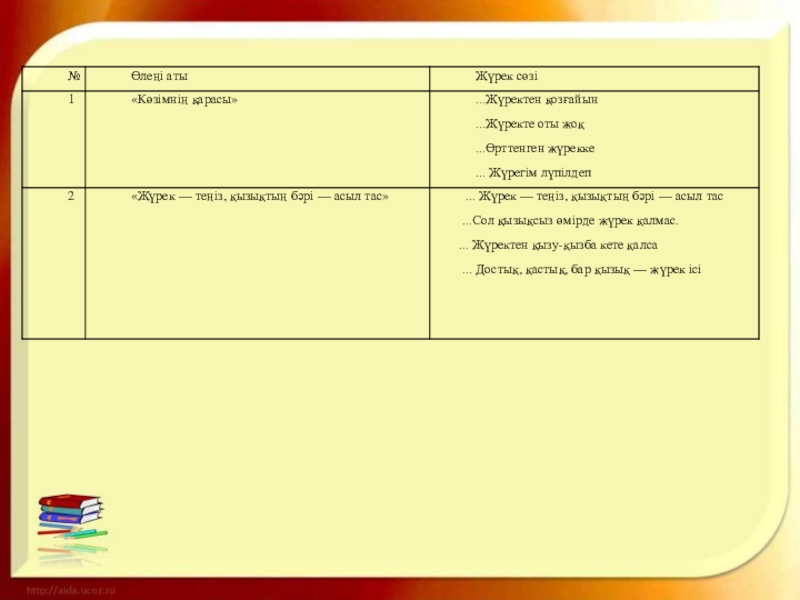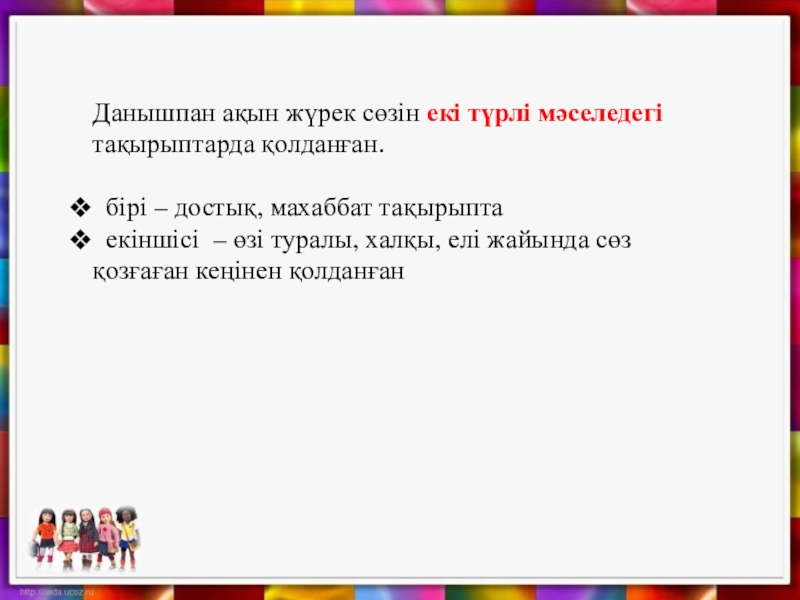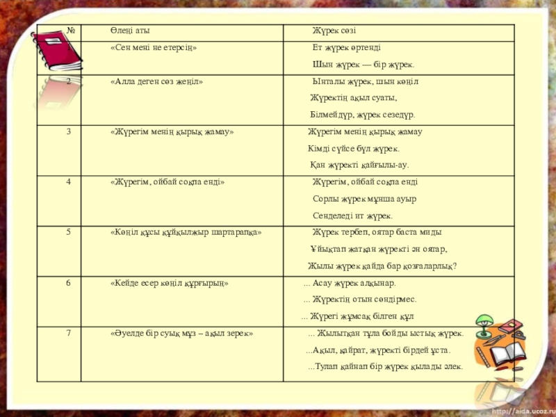 Слайд 9Данышпан ақын жүрек сөзін екі түрлі мәселедегі тақырыптарда қолданған.
