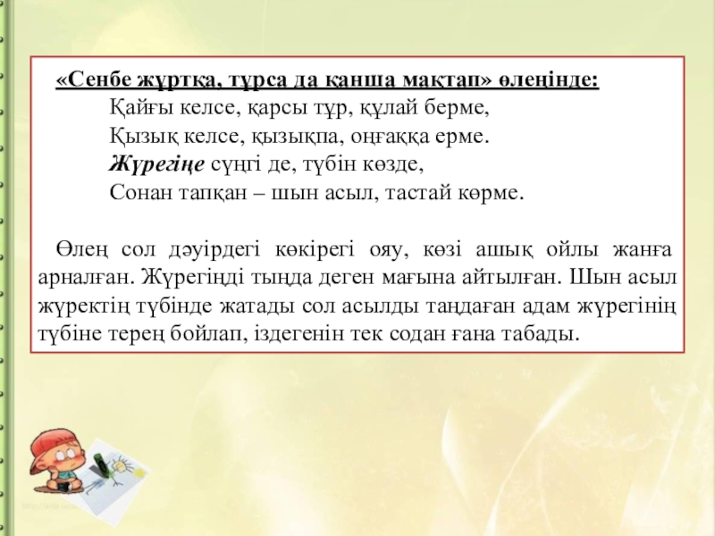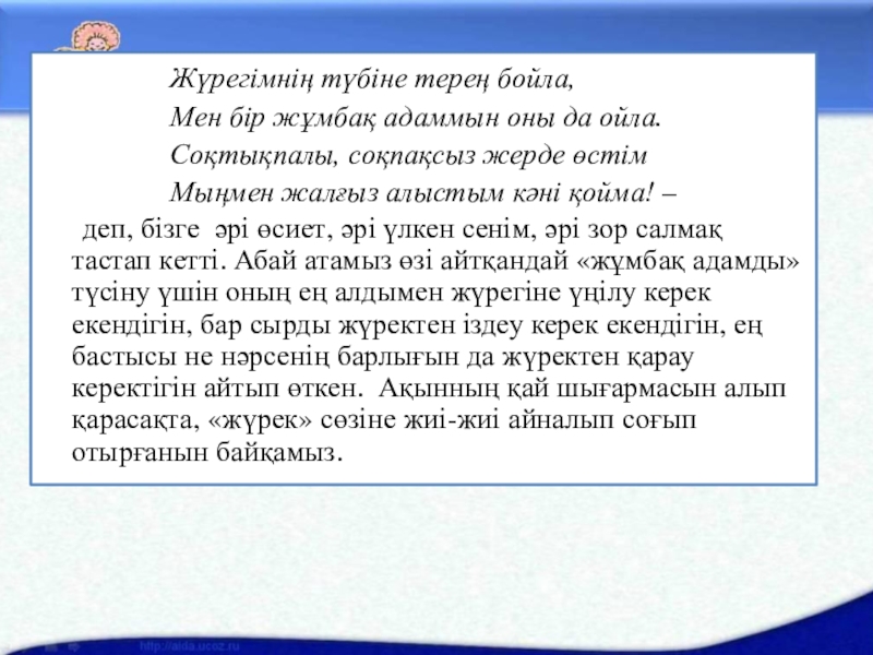 Слайд 8 Жүрегімнің түбіне терең бойла,