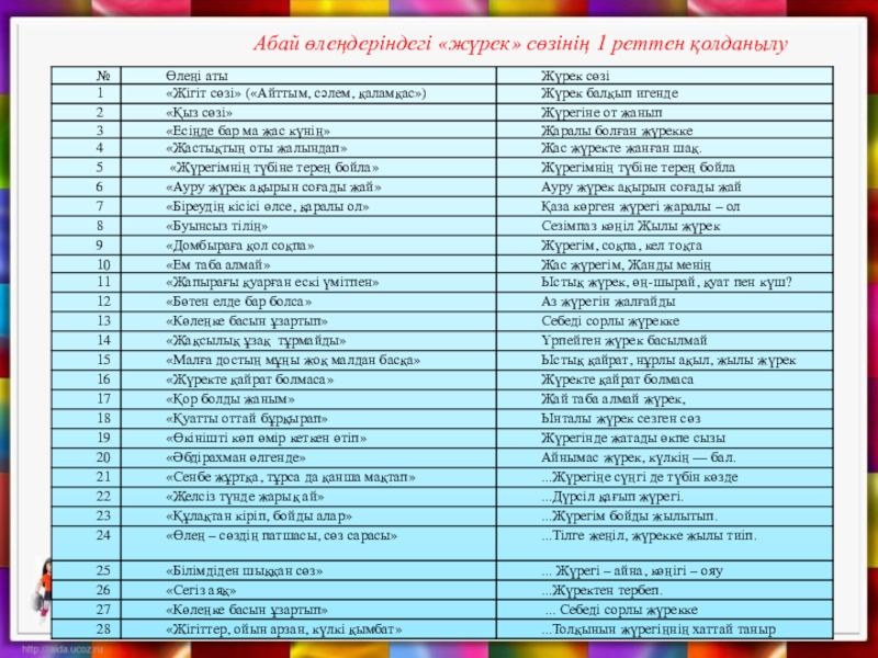 Слайд 17Абай өлеңдеріндегі «жүрек» сөзінің 1 реттен қолданылу