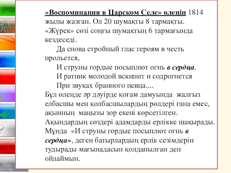 Слайд 25«Воспоминания в Царском Селе» өлеңін 1814 жылы жазған. Ол 20 шумақты
