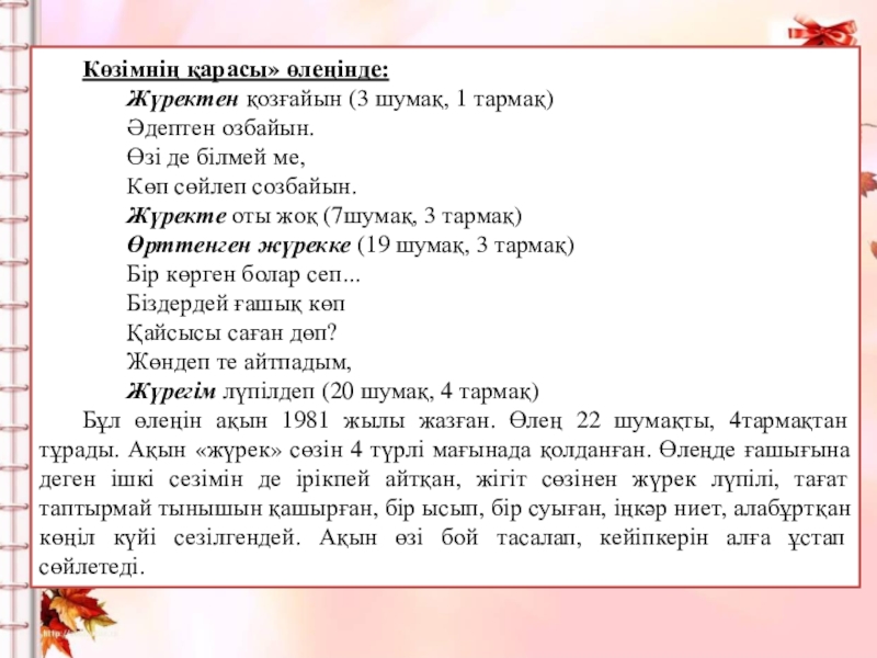 Слайд 11Көзімнің қарасы» өлеңінде: