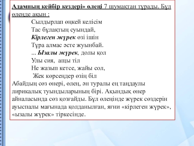 Слайд 13Адамның кейбір кездері» өлеңі 7 шумақтан тұрады. Бұл өлеңде ақын :