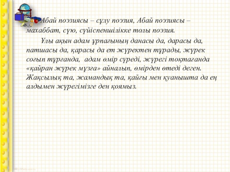 Слайд 7 Абай поэзиясы – сұлу поэзия, Абай поэзиясы – махаббат, сүю, сүйіспеншілікке