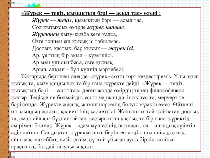 Жоғарыда берілген өлеңде «жүрек» сөзін төрт кездестіреміз. Ұлы ақын қызық та, қызу қандылық та бір ғана жүректе дейді. «Жүрек — теңіз, қызықтың бәрі — асыл тас» деген жолда өмірдің терең философиясы жатыр. Теңізде не болмайды, асыл маржан да, інжу тас та, меруерт те – бәрі сонда. Жүректе жасық, жаман нәрсенің болуы мүмкін емес. Өйткені ол асылдың асылы, қасиеттінің қасиеттісі. Жалыны оттай жайнаған достық та, амал-айласы бұқпантайлап жасырынған қастық та бір ғана жүректің әмірімен болмақ. Жүрек – адам мүшесінің патшасы, ол – шындық сүйетін әділ патша. Сондықтан жүрекке шын берілген көңіл, шынайы достық, айнымас махаббат, нәзік сезім, сүттей ұйыған ауыз бірлік, ағайын арасының балдай татулығы қажет.