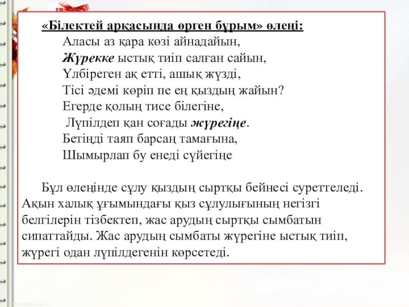 Слайд 12«Білектей арқасында өрген бұрым» өлеңі: