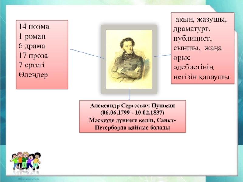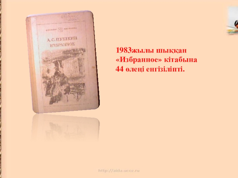 Слайд 22Орыс халқының ұлы ақыны Пушкин шығармаларын сүйіп оқығандықтан, оның 1983жылы шыққан