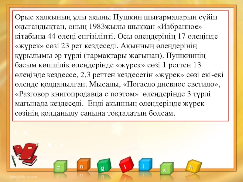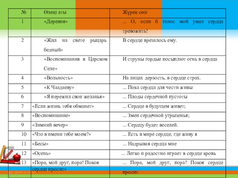 Пушкин өлеңдеріндегі жүрек сөзінің қолданылу ерекшелігі.