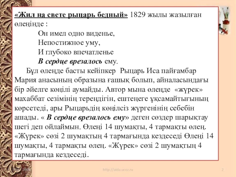 Слайд 24«Жил на свете рыцарь бедный» 1829 жылы жазылған өлеңінде :