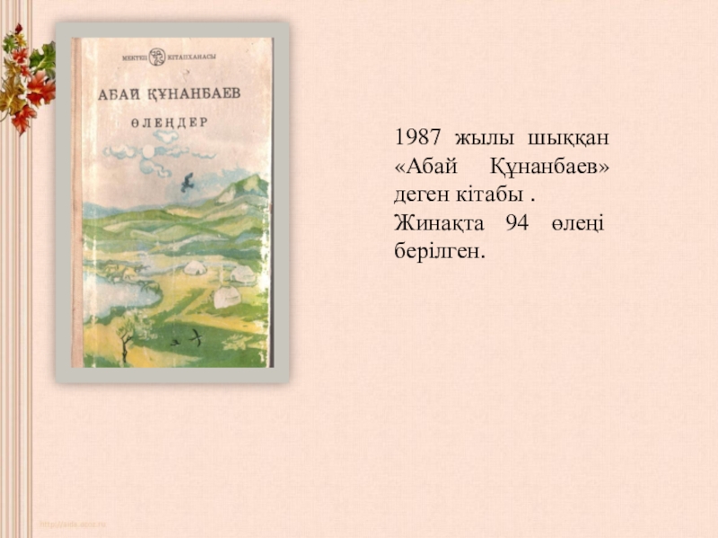 Слайд 101987 жылы шыққан «Абай Құнанбаев» деген кітабы .