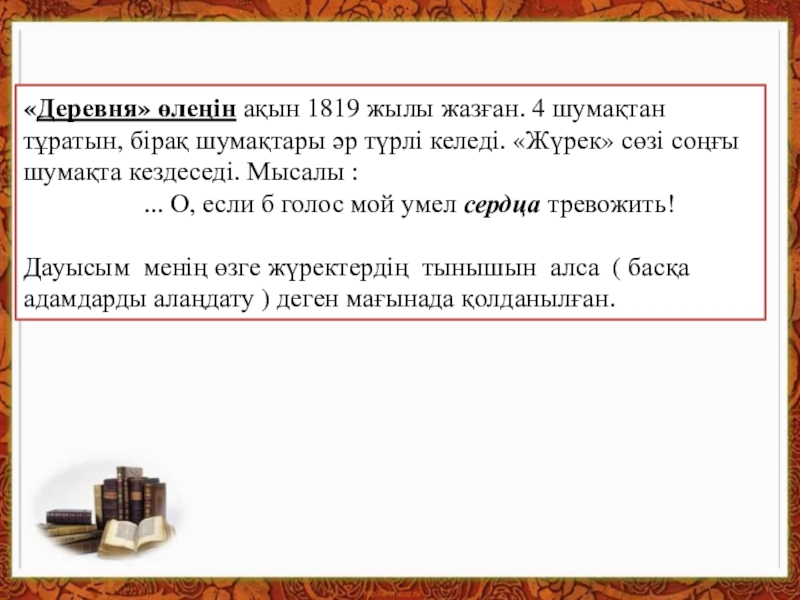 Слайд 23«Деревня» өлеңін ақын 1819 жылы жазған. 4 шумақтан тұратын, бірақ шумақтары