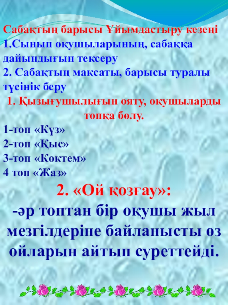 -әр топтан бір оқушы жыл мезгілдеріне байланысты өз ойларын айтып суреттейді.