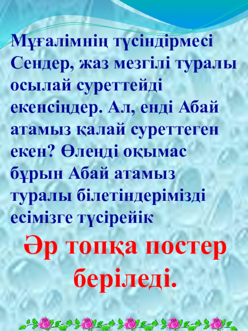 Мұғалімнің түсіндірмесіСендер, жаз мезгілі туралы осылай суреттейді екенсіңдер. Ал, енді Абай атамыз қалай суреттеген екен? Өлеңді оқымас