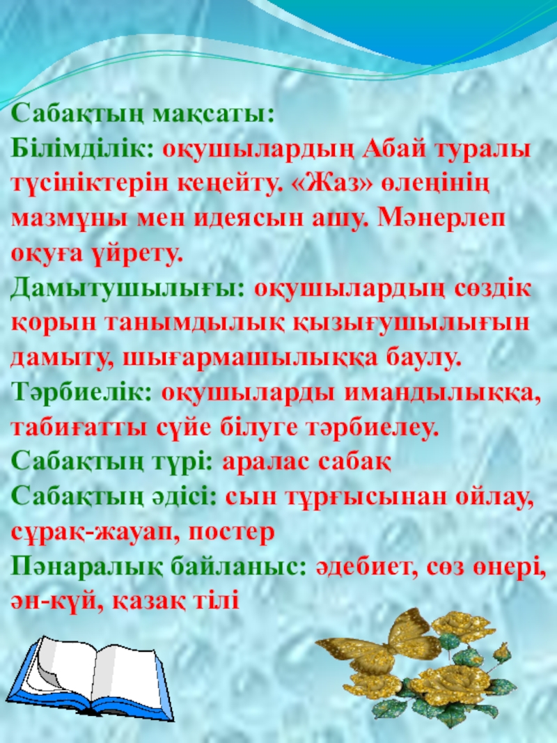 Білімділік: оқушылардың Абай туралы түсініктерін кеңейту. «Жаз» өлеңінің мазмұны мен