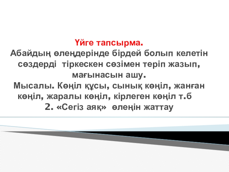 Слайд 13Үйге тапсырма. Абайдың өлеңдерінде бірдей болып келетін сөздерді тіркескен сөзімен теріп